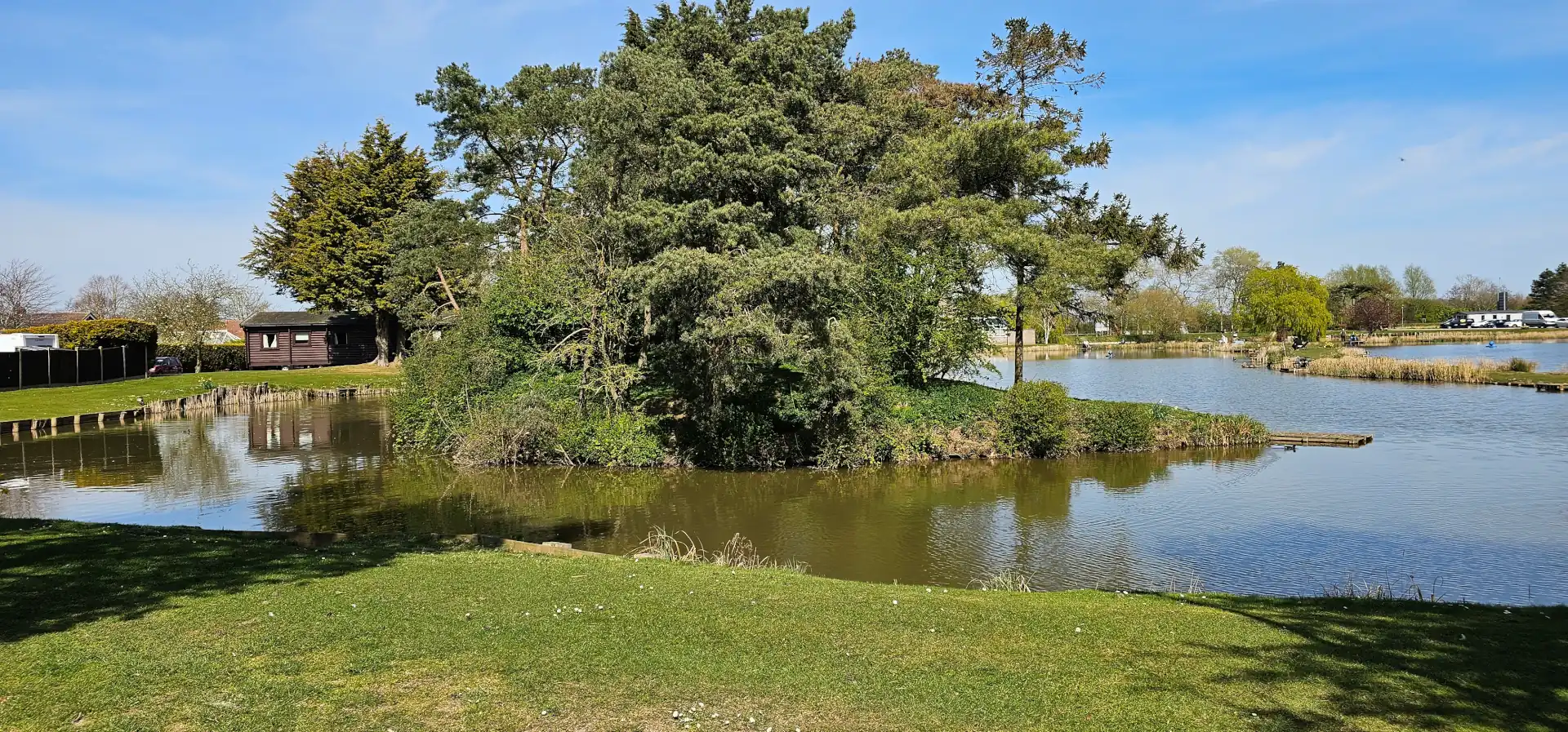 Island Lake is a two-acre fishing spot with an island, shaded pines, and diverse species including Tench, Carp, Roach, Perch, and Rudd, offering excellent angling opportunities near the log cabins.